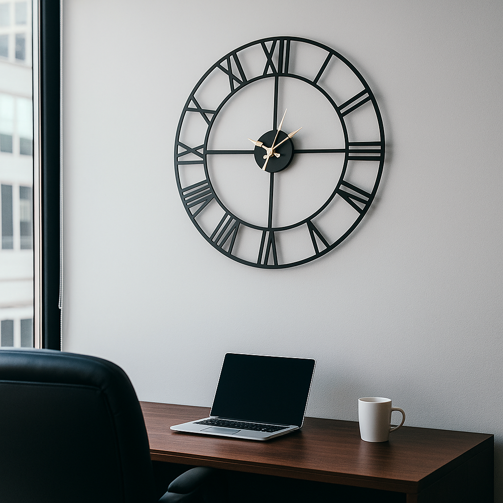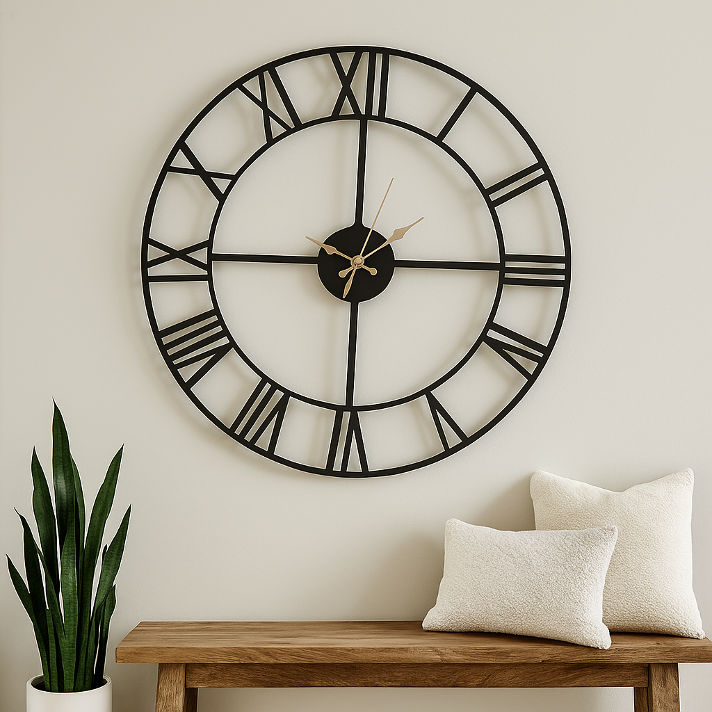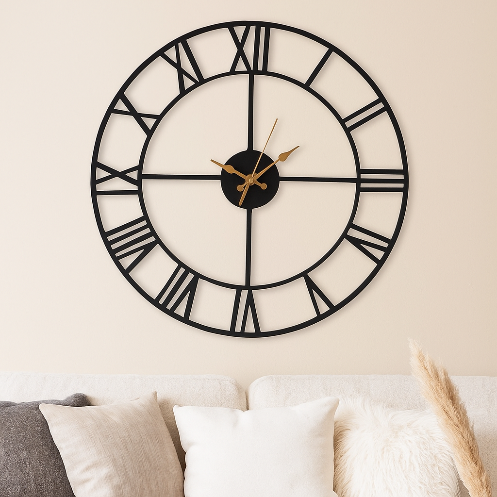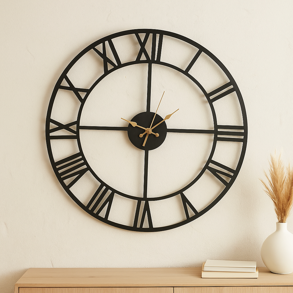 - تصميم كلاسيكي فاخر مستوحى من ساعات الزمن القديمة، مع أرقام رومانية واضحة وإطار معدني مزخرف يضفي طابعًا تاريخيًا أنيقًا على الساعة.